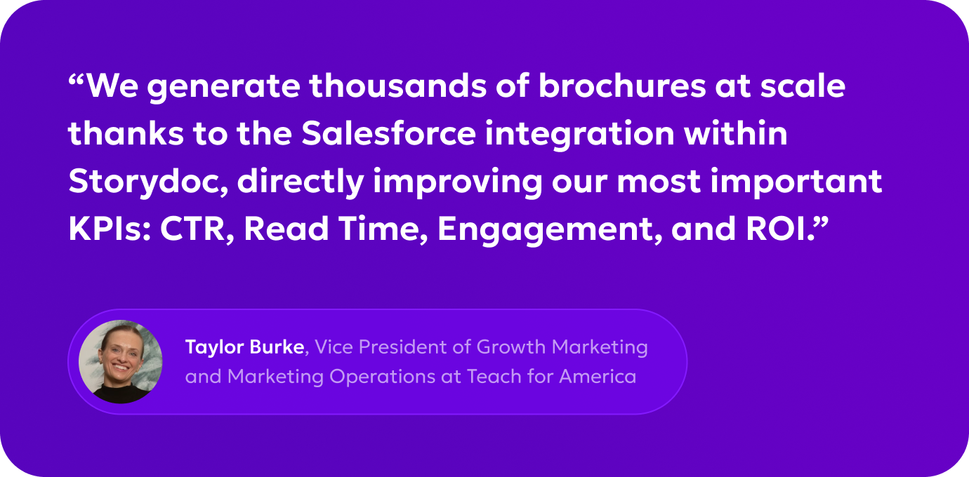 From kickoff to go‑live, Storydoc’s Success Management Team worked hand and hand with the Teach for America team, covering account setup, team training, Salesforce Integration, and even design of bespoke Storydoc decks.
