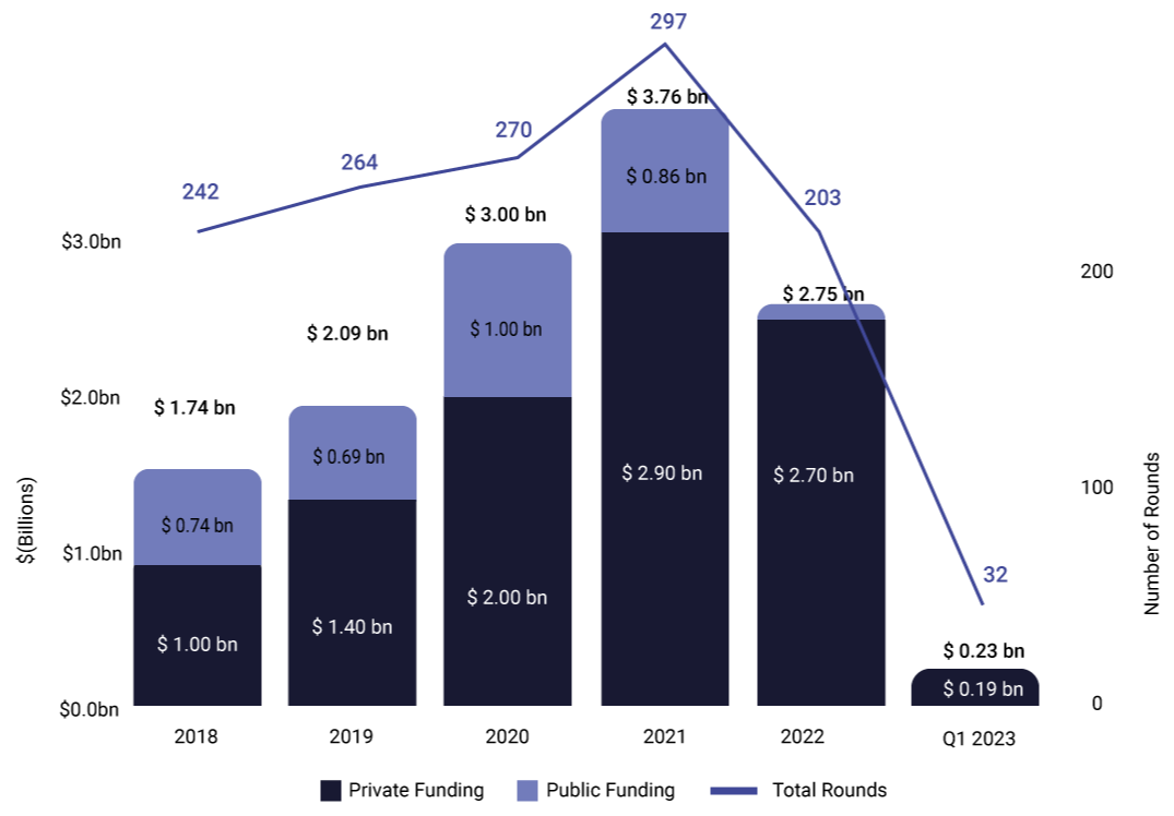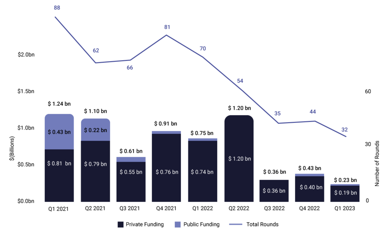 However, the Health Tech sector experienced a slowdown in Q1 2023, with only $226M in equity invested across 32 rounds, a nearly 50% decrease from Q4 2022, and a 70% fall compared to the first quarter of the same year.
