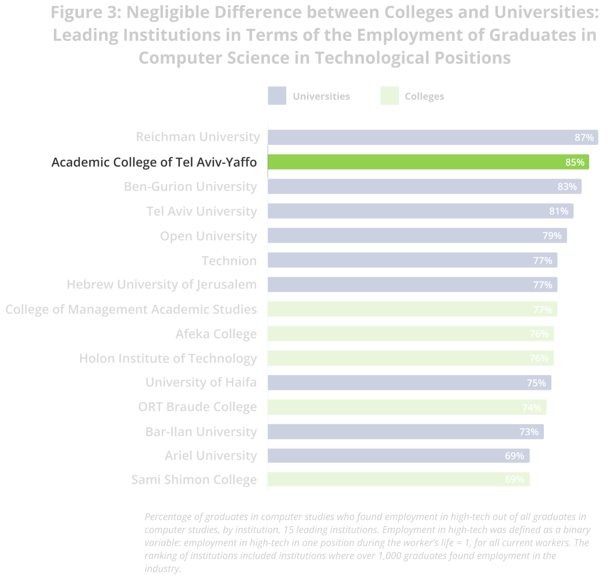 College graduates integrate into high-tech at high rates. Among those with a computer studies degree, there is a small gap in favour of universities in terms of integration rates: 78% in universities versus 69% in colleges. However, the variance between the groups is small compared to the variance within the groups, as there are colleges with higher integration rates than most universities.