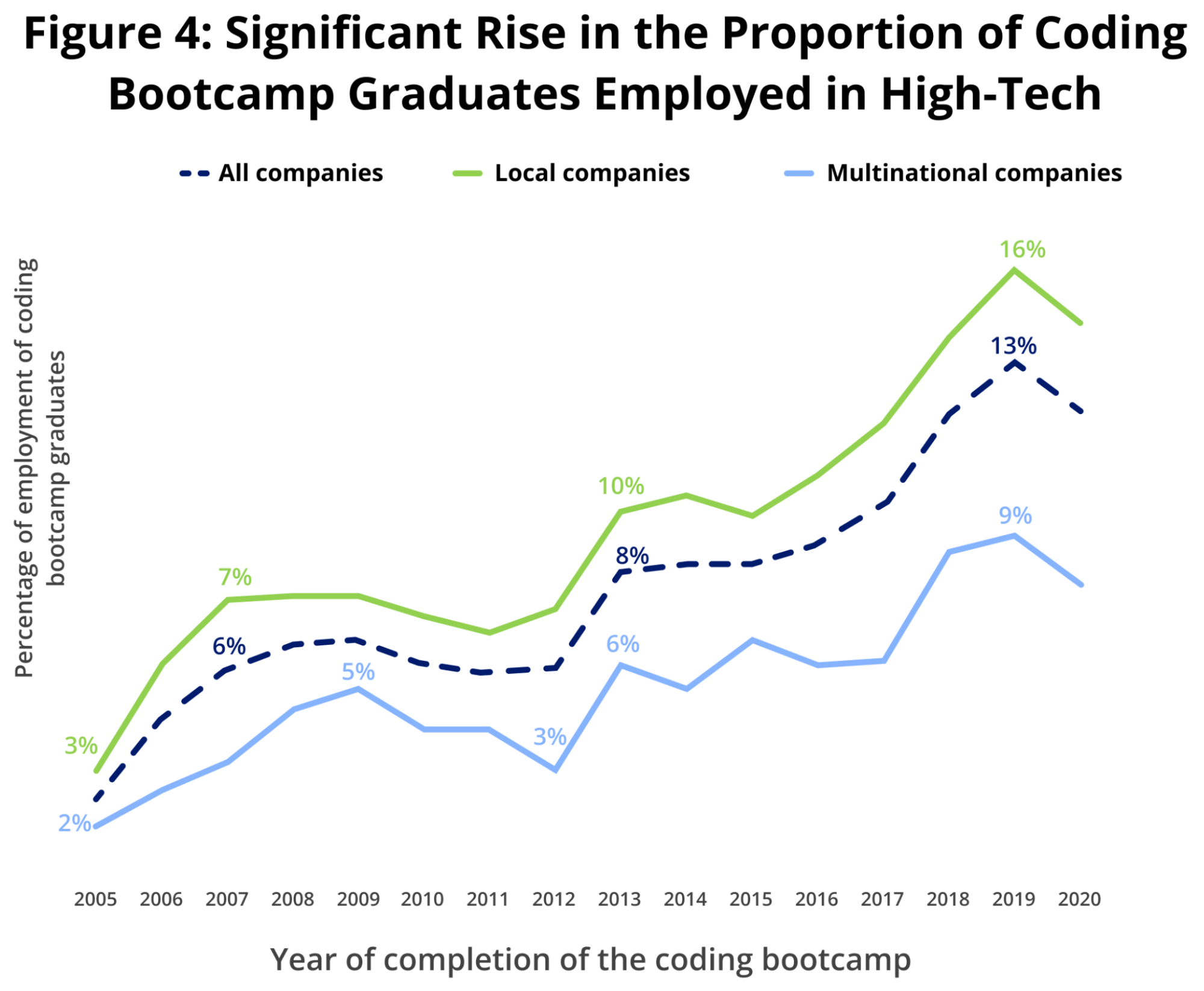 Coding bootcamps are becoming increasingly popular as an additional form of high-tech training. In fact, the rate of graduates who successfully land technological roles in high-tech has risen steadily from a mere 3% in 2005 to 13% in 2019. Presently, 9% of all Israeli high-tech employees are graduates of these programs.