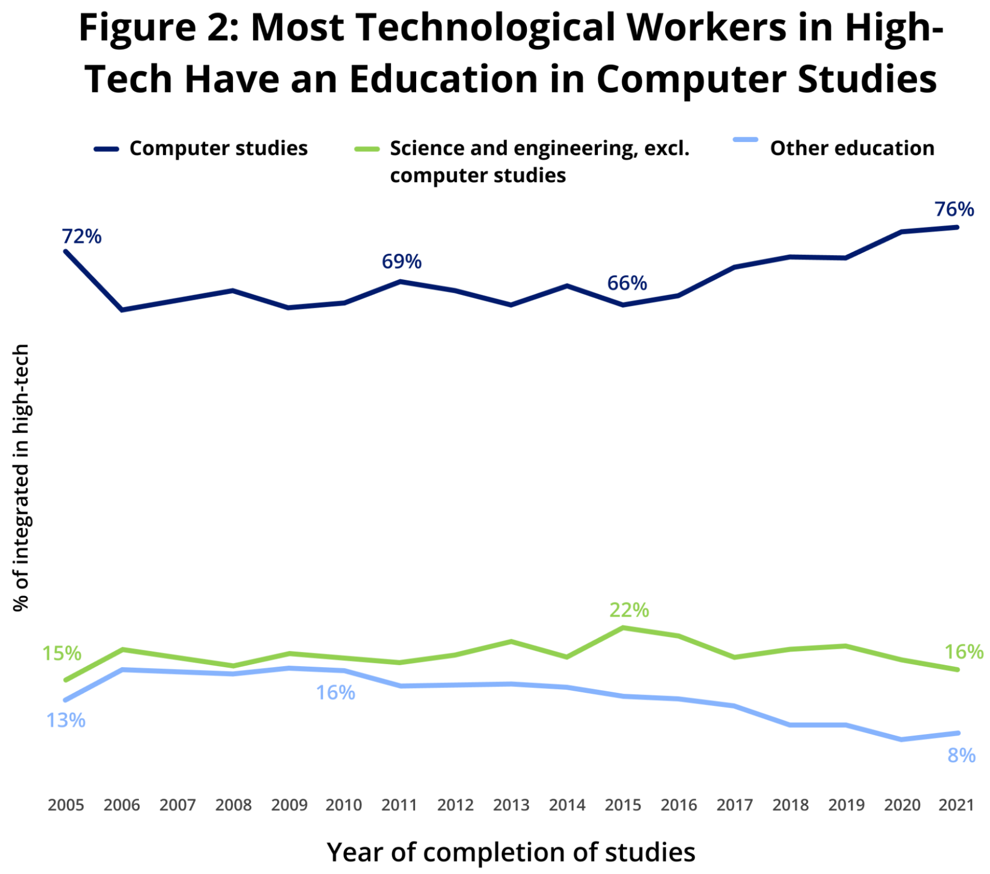 The main entry point to the high-tech industry continues to be computer studies. In fact, 72% of individuals with a degree in computer studies eventually join high-tech companies at some point in their career.